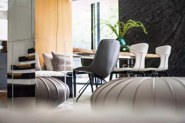 由家具來定義聚合,整個底層沒有硬性分隔,卻變成了一整個大型的“活動”空間。一個實(shí)木臺面與大理石基座拼合的島臺,配上幾把高腳餐椅,再加上一整塊天然原木的餐桌和純牛皮餐椅,就是放松的餐廚空間;圓形茶幾、柔軟沙發(fā)、絲絨地毯,圍攏出舒服的灰色調(diào)客廳。